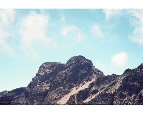 圖為:從玉山北峰鞍部仰望玉山主峰的神采。乾枯的裸岩、飽經風雪冰霜的容顏,那是億萬年歲月留下的軌跡。不過,筆者卻曾在這裡撿拾到海底的貝殼化石,顯然在不知道多少億萬年前,台灣的最高峰玉山,都曾經是在深海之中,經過地層的擠壓,才造就了今天傲立全台、雄霸雲端的模樣。