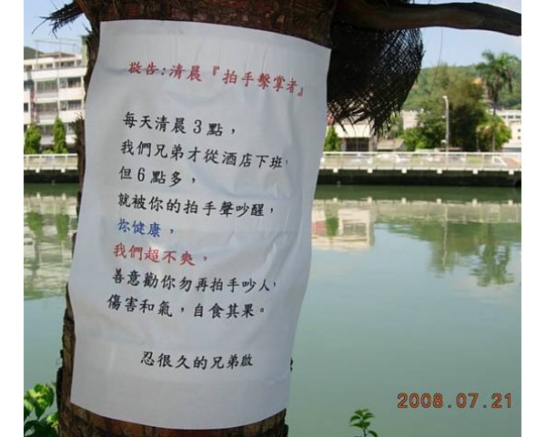 附圖:「拍手功」打擾他人清靜,從出現在高雄市愛河旁「忍很久的兄弟」所張貼的「告示」,可見它已引發不少人的反感。